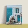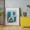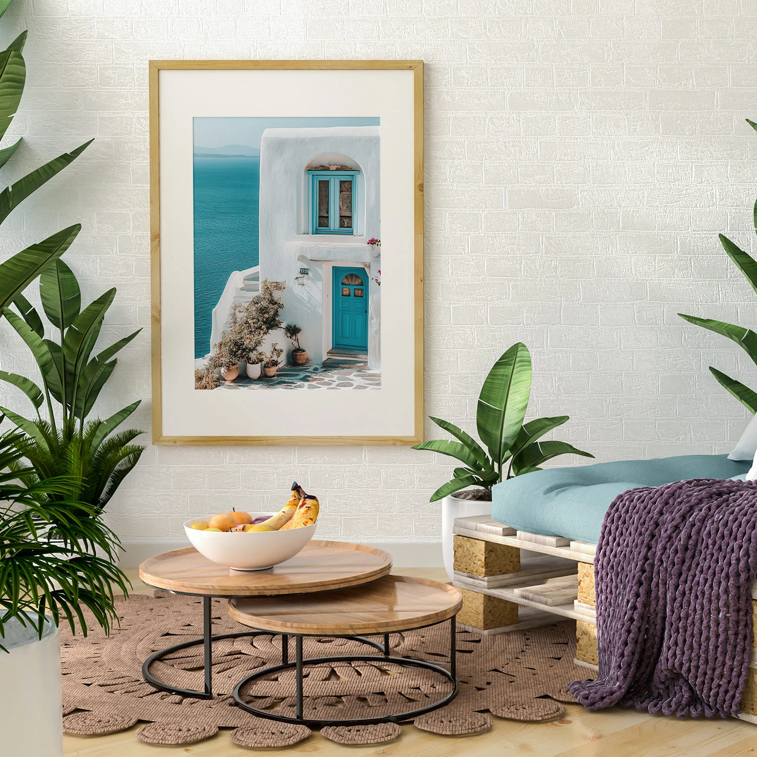 Sun-washed Santorini serenity: whitewashed walls, turquoise doors, potted blooms, and the infinite Aegean beyond. Clean lines and crisp light create a soothing coastal mood. A timeless travel piece for interiors seeking breezy minimalism and Mediterranean calm.